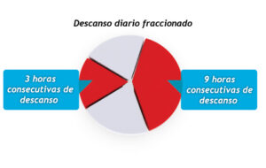 Alternativamente, el período de descanso diario normal se podrá tomar en dos períodos, el primero de ellos de al menos tres horas ininterrumpidas y el segundo de al menos 9 horas ininterrumpidas.